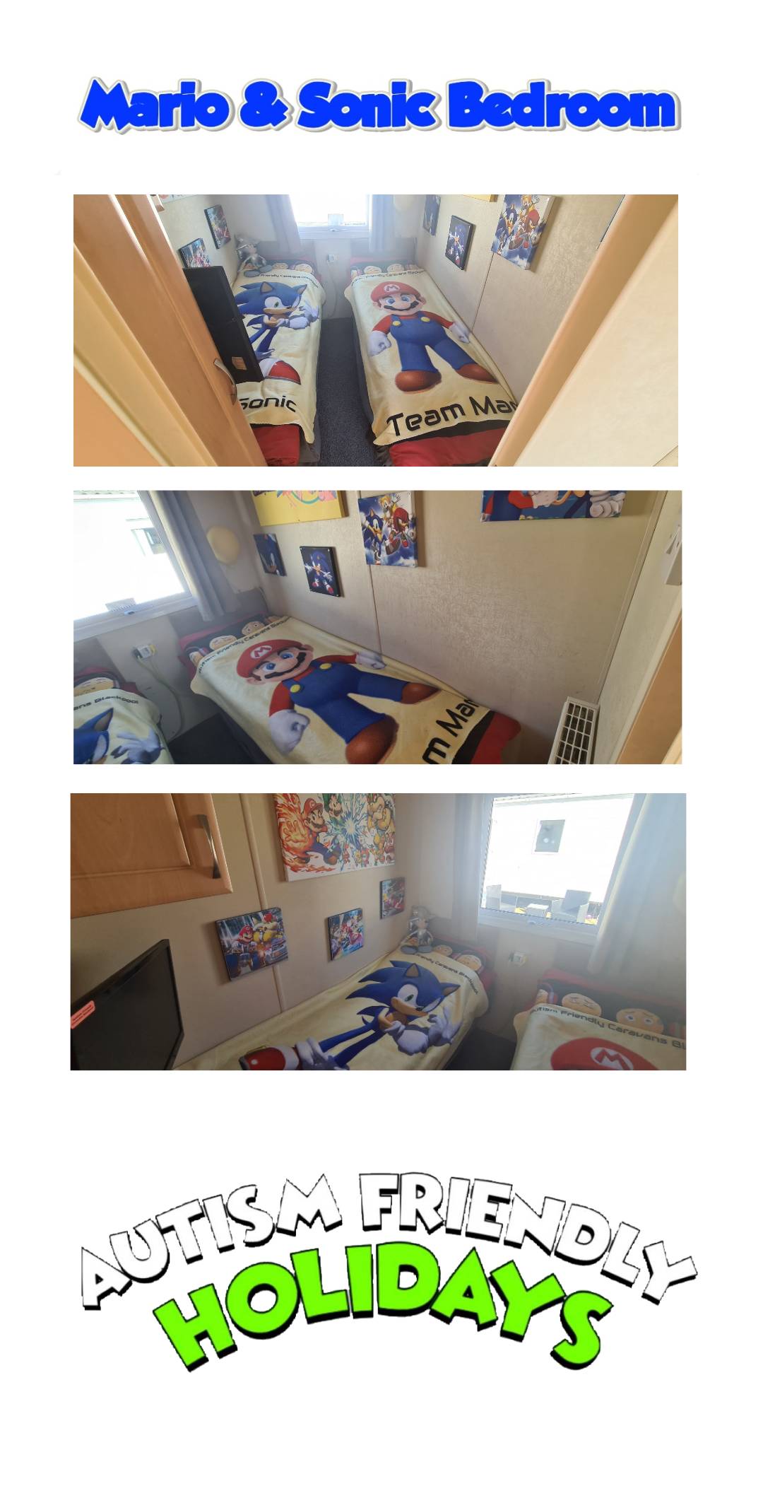 The 2 caravans are our biggest caravan for bigger families. They are both 10 Berth, 4 Bedrooms and have sensory play dens with water bubble walls. The Spongebob caravan has a water sensory bubble table. They both have sensory play corners. Spongebob Caravan have a wheelchair access ramp. Like all the caravans it has television/DVD player in all the bedrooms, Popcorn ,machine, hot dog makers, dolce gusto coffee maker. Both include Gaming which includes PlayStation4 and Nintendo Wii U. They also have secure outside decking.